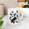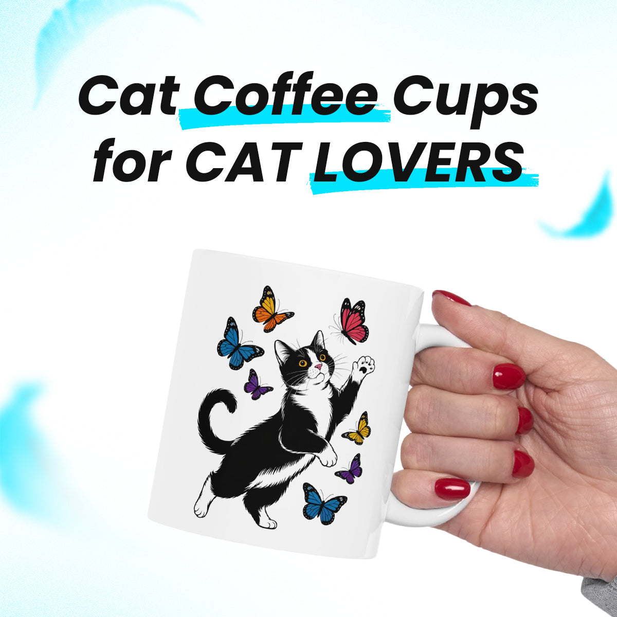 Butterfly with Tuxedo Cat Mug – Adorable Cat Lover Coffee Cup in White and Black – 11oz Ceramic Gift Mug