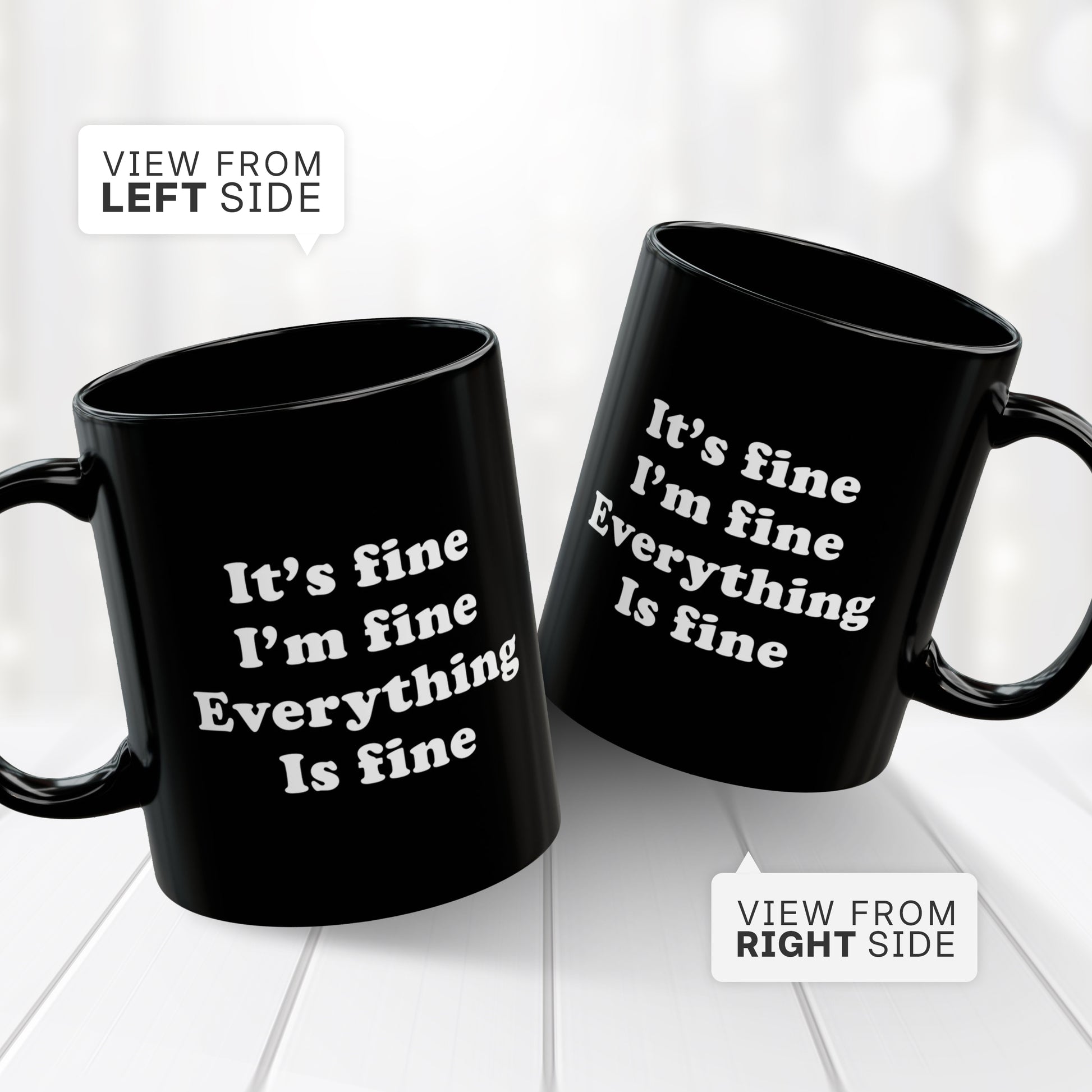 - Features the humorous quote: “It’s Fine I’m Fine Everything Is Fine” with a cute black cat design