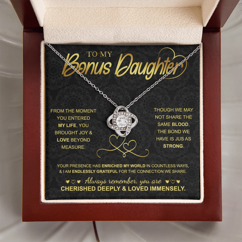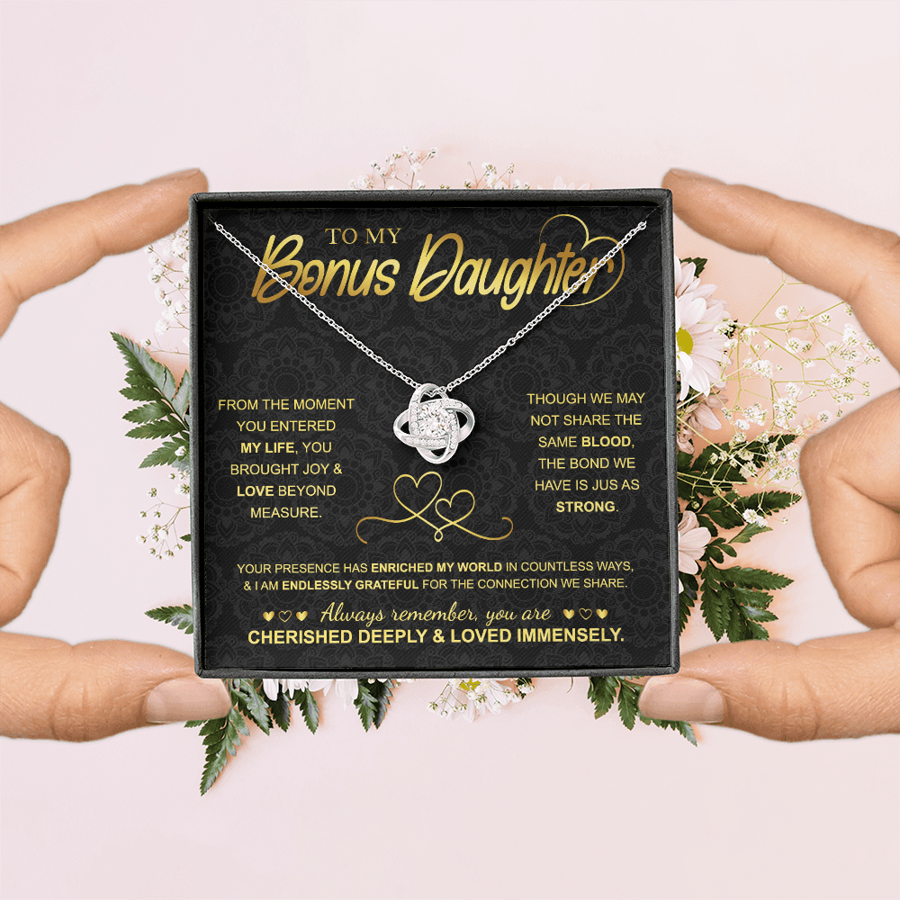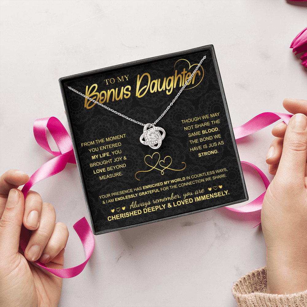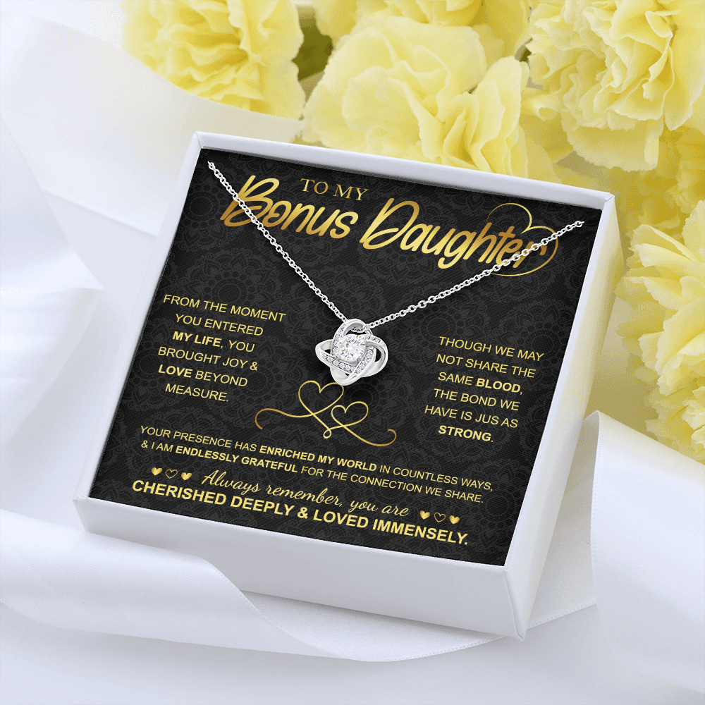 Show your bonus daughter how much she means to you with this heartfelt Love Knot Necklace from Mom. Designed for the incredible stepdaughter who may not be yours by birth but is deeply loved as your own, this sterling silver necklace is a powerful symbol of your unbreakable bond.